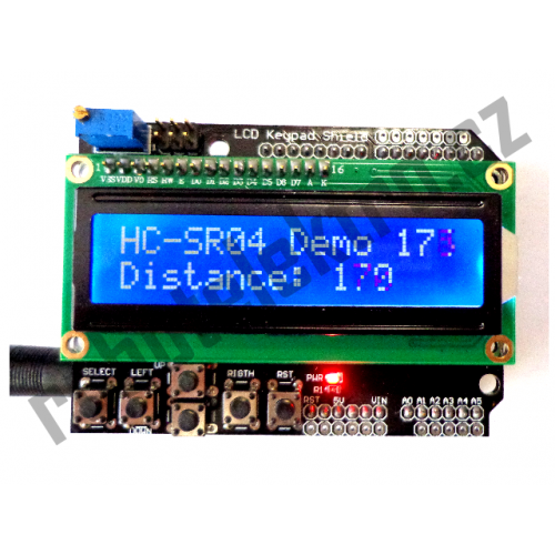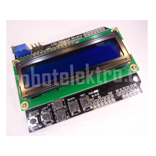 Znakový LCD displej, 16 znaků, 2 řádky. Přímo na desce modulu je pět tlačítek, + tlačítko pro reset Arduino desky.
