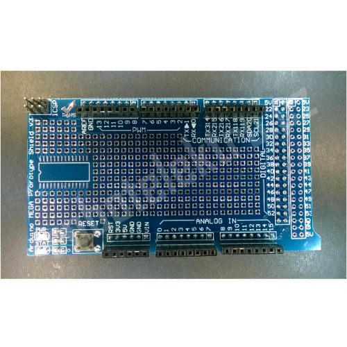 Rozšiřující modul pro vlastní zapojení k desce MEGA. Na modulu jsou prokovené otvory v rastru 2,54mm pro připájení vlastních součástek a místo na připájení integrovaného obvodu v pouzdře SMD, s až 28 vývody. K modulu patří i miniaturní kontaktní pole (170 bodů) pro testování zapojení, kontaktní pole lze nalepit doprostřed modulu.