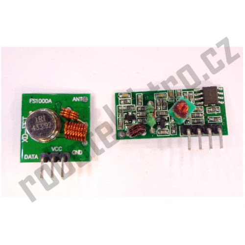 Sada rádiového vysílače a přijímače, hodí se i k Arduinu pro bezdrátový přenos dat. Dosah ve volném terénu až 100m, v místnosti odzkoušeno cca 20m. Dosah velice záleží na vlastnostech přidané antény, dobře funguje s anténou o délce ¼ vlnové délky vysílací frekvence, pro 315MHz je to asi 24cm, postačí zvonkový drátek.