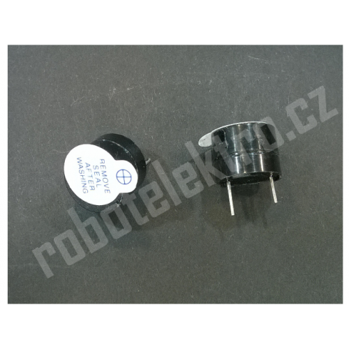 Bzučák s piny, vhodné k připojení přímo do kontaktního pole. Kladný pól je označený shora na plastovém pouzdru. Funguje už od napájecího napětí 2,5V.