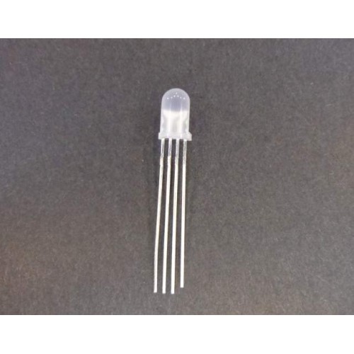 Tříbarevná LED dioda v mléčném pouzdře, které zvýrazňuje efekt míchání barev. Dioda má čtyři vývody, společnou Katodu a zvlášť Anodu k červené,zelené a modré.