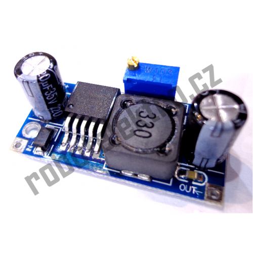 Modul snižujícího měniče napětí (step-down) pro jednoduchou konstrukci napájecího zdroje. Modul používá integrovaný obvod LM2596. Na desce měniče je víceotáčkový trimr pro velice jemné nastavení výstupního napětí.