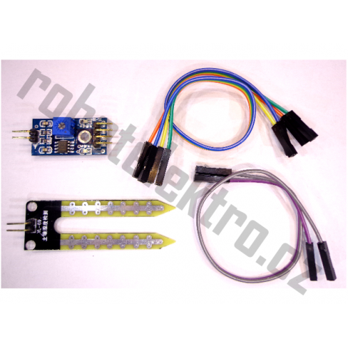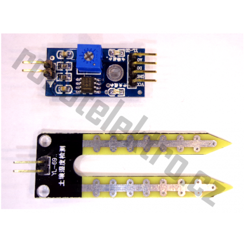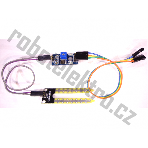 Senzor vlhkosti s digitálním i analogovým výstupem. Nastavení citlivosti pomocí trimru na plošném spoji. Pokud je sonda v suchu nebo vlhkost nepřekročí nastavenou mez, je na digitálním výstupu log.1, při dosažení nastavené úrovně vlhkosti se překlopí do log.0 . Na analogovém výstupu je hodnota shodná s napájecím napětím a klesá k nule se zvětšující se vlhkostí na sondě (od minimální nastavené hranice). Na plošném spoji jsou dvě LED diody pro signalizaci připojeného napájení a log.0 na digitálním výstupu. K senzoru je dodávána zapichovací sonda na plošném spoji, např. k zapíchnutí do hlíny v květináči.