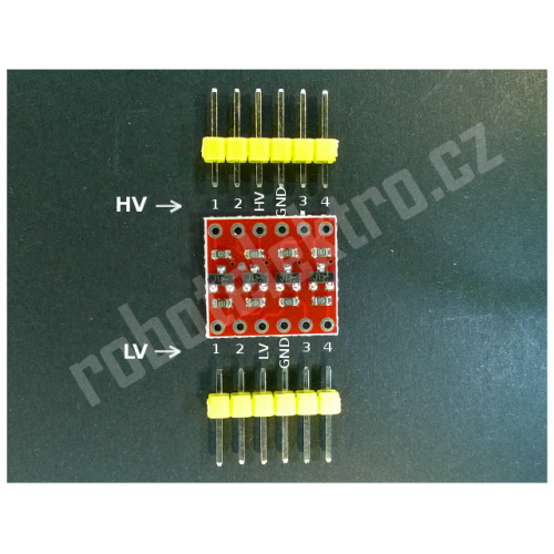 Zapojení je velice jednoduché, stačí postupovat podle tabulky a připojit obě napájecí napětí (3,3 a 5V) pak přivedením 3,3V na pin LV1 získáme 5V na pinu HV1 a nebo naopak přivedením 5V na pin HV1 dostaneme napětí 3,3V na pinu LV1, současně lze využít až 4 samostatné kanály.