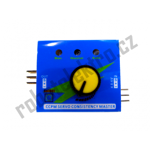 Lze připojit a testovat až 3 serva současně a tím zkontrolovat jejich synchronizaci. Volba módu se provádí stiskem tlačítka „select“ zvýrazněném na papírové krabičce testeru. Podle zvolého módu svítí příšlušná modrá LED dioda.