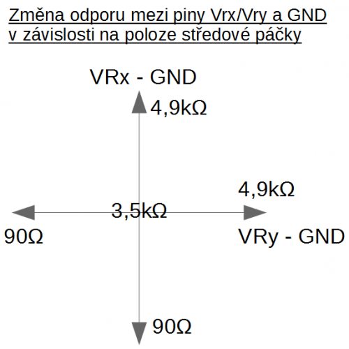 Hodnota odporu mezi piny VRx / VRy a GND je při pozici páčky uprostřed cca 3,5kΩ, v krajní poloze vlevo/nahoře je to cca 90Ω a při poloze zcela vpravo/dole cca 4,9kΩ. Více na přiloženém schématu.